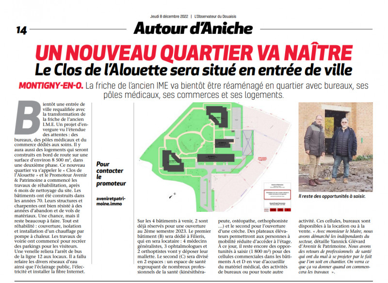 [ On parle de nous ! ] On parle de nous dans l'Observateur du Douaisis - Editions du 8 décembre 2022. Merci pour cet article Nouveau quartier : Le Clos de l'Alouette - Montigny-en-Ostrevent En cours de rénovation # Montigny-en-Ostrevent #douai